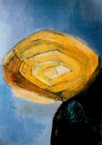 Hervorzuheben ist auch, wie virtuos Anne Fenchel das Thema Raum behandelt. Da gibt es eine offenbar schon etwas ältere Gruppe von „Liegenden“, die mit der „Gelben Landschaft“ von 1995 in Verbindung stehen. Zunächst faszinieren die Silhouetten der „Liegenden“, die wie es scheint immer ein Paar sind, ein liebendes Paar. Während das erste in einem genau mit Wänden bezeichneten Zimmer gemalt ist, könnte das zweite auf einer Wiese unter einem hohen Himmel liegen, denn seitliche Bildbegrenzungen gibt es nicht mehr. Im dritten Bild ist der Raum imaginär geworden, nur noch hellgelber Hintergrund. Aber die Figuren sind dennoch fest verankert in diesem Licht-Raum, obwohl sie eigentlich schweben.